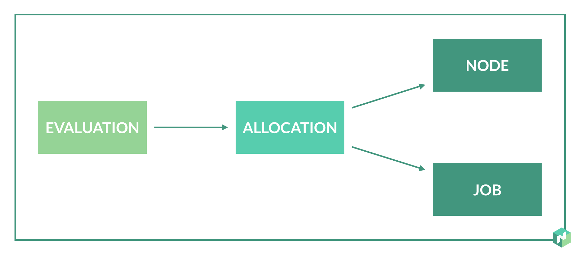 Jobs are submitted by users and represent a desired state. A job is a declarative description of tasks to run which are bounded by constraints and require resources. Nodes are the servers in the clusters that tasks can be scheduled on. The mapping of tasks in a job to nodes is done using allocations. An allocation is used to declare that a set of tasks in a job should be run on a particular node. Scheduling is the process of determining the appropriate allocations and is done as part of an evaluation. Deployments are objects to track a rolling update of allocations between two versions of a job.