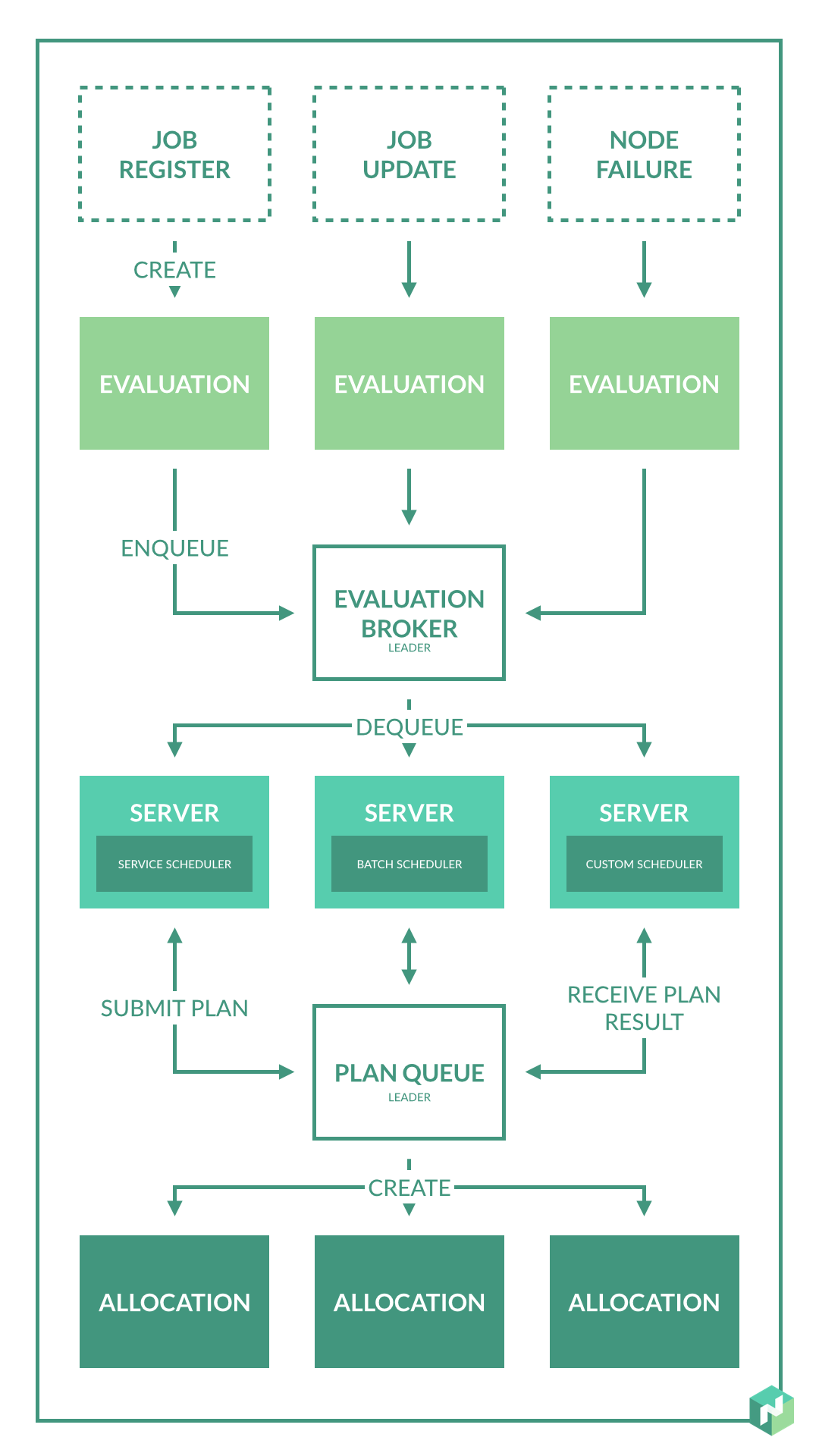 This diagram shows the flow of an evaluation through Nomad: